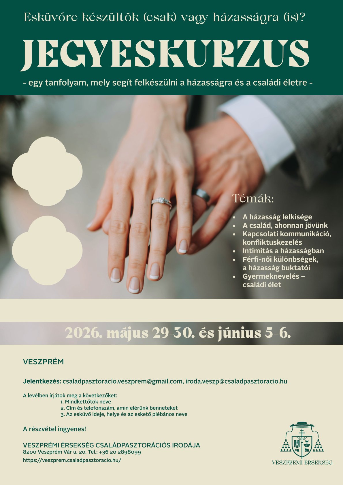Jegyeskurzus alkalmai 2026. május 29-30. és június 5-6. napjain Veszprémben kerülnek megtartásra.