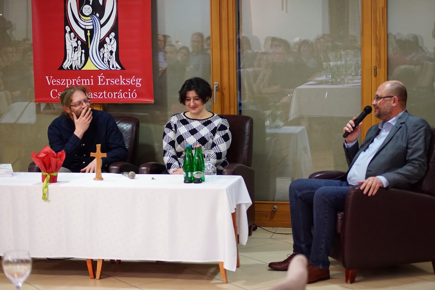 Az est folytatásában Varró Dániel költővel és feleségével, a veszprémi születésű Gelencsér Zsófiával beszélgetett Gerstmár Ferenc házasságról, költészetről, könyvekről és gyereknevelésről. A jó hangulatú beszélgetésből kiderült, hogy családi életükben fontos szerepet kap a humor, jóllehet, Daniék ezen a téren is sokszínűek: van, aki inkább a nyelvi humort, van, aki a szóvicceket, míg más az iróniát érzi inkább magáénak; így még a családtagok sem mindig értik egymás humorát. Bár más-más közegből érkeztek, és különböző neveltetést kaptak, de családjuk bővülésével párhuzamosan a gyereknevelésben is megtalálták a közös hangot. Dani elmesélte, hogy amikor első kisfiuk megszületett és ő kézbe vette a síró újszülöttet, tanácstalanságában elkezdte szavalni neki az első verset, ami hirtelen eszébe jutott – ez éppenséggel Ady Endre: Párisban járt az Ősz című műve volt –, és nagy meglepetésére a csecsemő rögtön abbahagyta a sírást. Ebből Dani azonnal levonta azt a következtetést, hogy a költészetnek bizony gyakorlati haszna van, hiszen még egy síró babát is képes megnyugtatni.