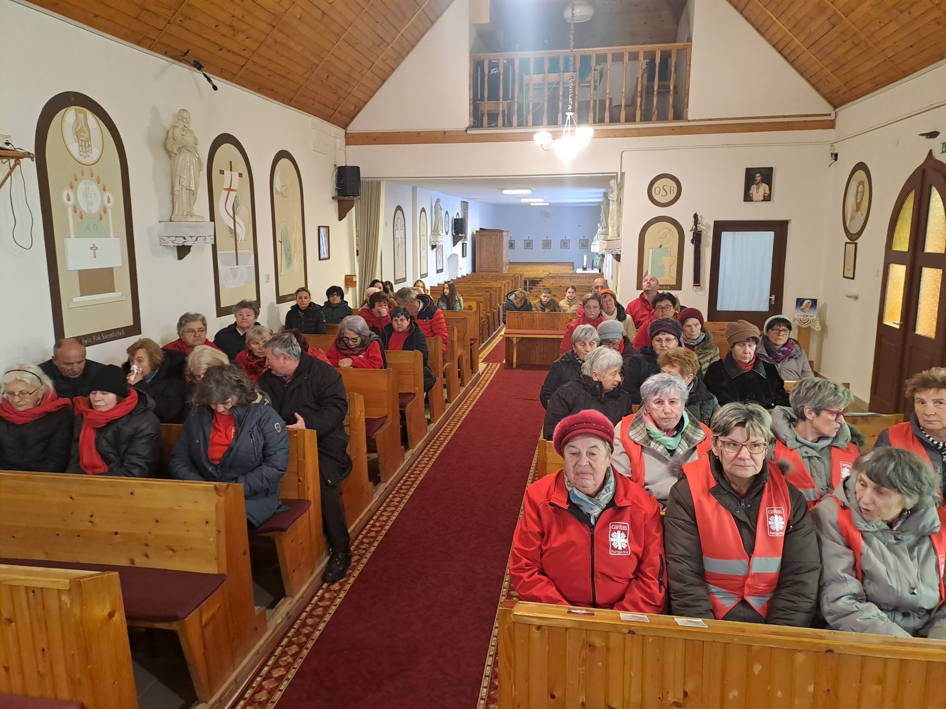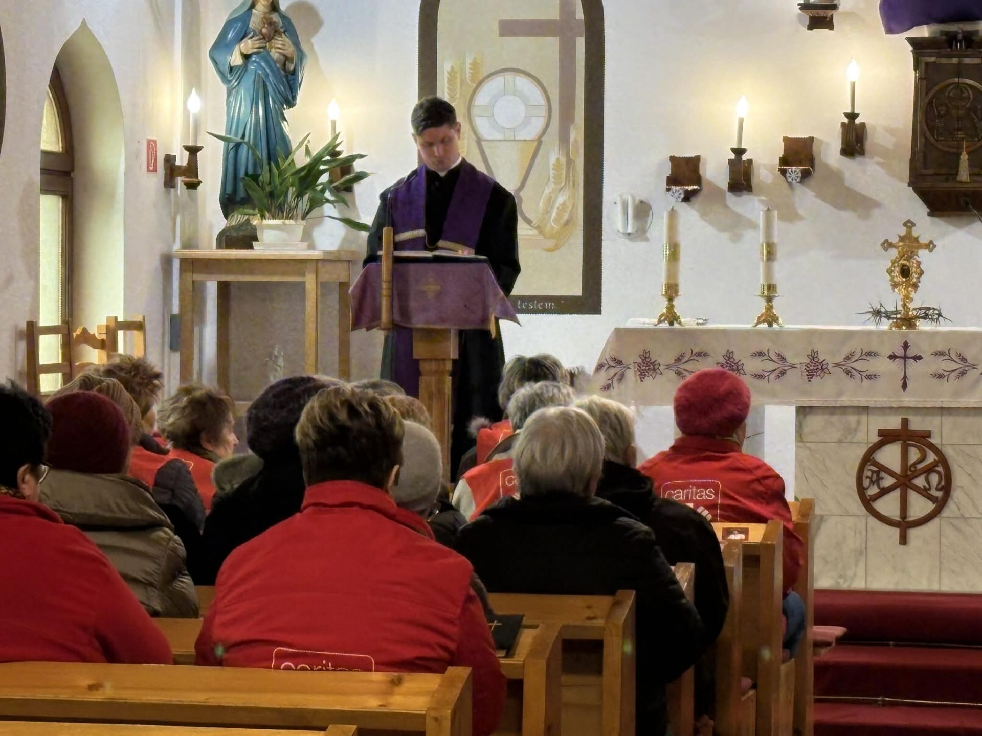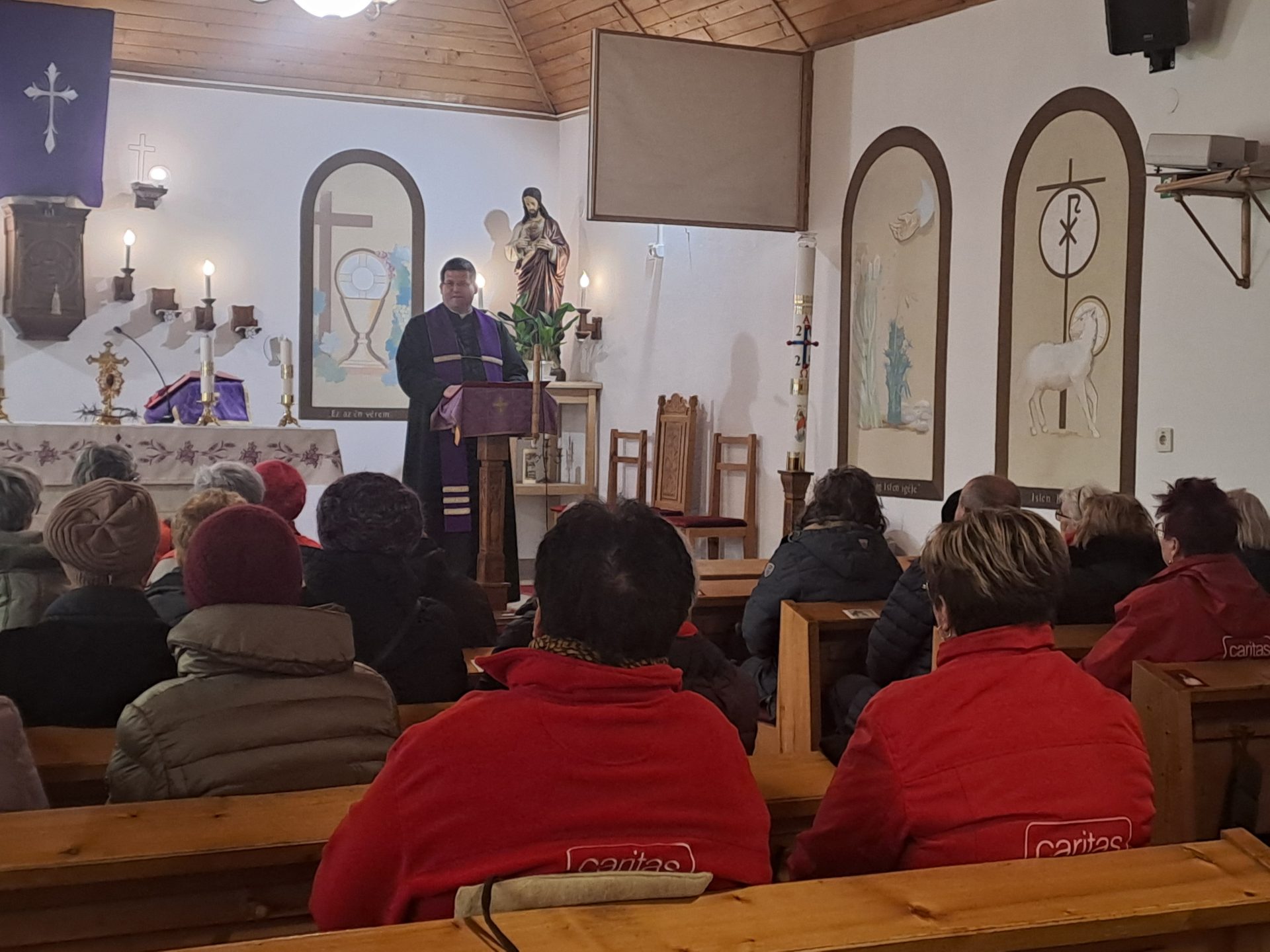 Ezt követően Cséry Gergő plébános atya osztotta meg gondolatait a jelenlévőkkel. Elmélkedésében a karitász szolgálatának mélyebb jelentésére világított rá. Virágvasárnaphoz közeledve hangsúlyozta: amikor egy önkéntes segít, nem csupán jót cselekszik; amikor meghallgat valakit, nem csupán empatikus; és amikor felemel egy rászorulót, nem csupán kedves. Mindezekben Isten szeretete válik láthatóvá, rajtunk keresztül válik megtapasztalhatóvá a másik ember számára.