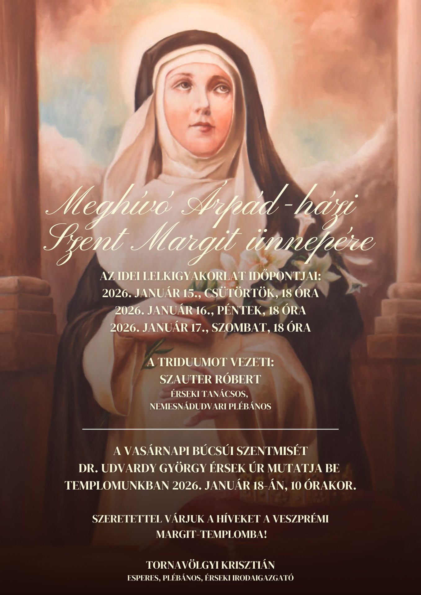 Az Árpád-házi Szent Margit tiszteletére rendezett ünnepre triduum keretében készülnek a veszprémi Margit-templomban. A háromnapos lelki felkészülés 2026. január 15–17. között, minden este 18 órakor kezdődik, amelyet Szauter Róbert érseki tanácsos, nemesnádudvari plébános vezet.