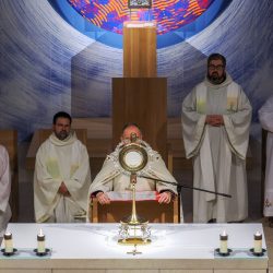 Az elsőcsütörtöki szentségimádás végén Gere Márk Dávid SMC atya mondott köszönetet az együttlétért, az imádság vezetéséért, a szolgálatokért és mindazokért, akik hozzájárultak az este megszületéséhez. A közös ima megerősítette a jelenlévőket abban, hogy az Egyház jövője Krisztus kezében van, aki ma is hív, küld és életet ad.