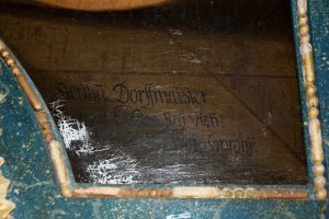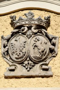 Figyelemre méltó az oltáron elhelyezett kettős címer is. A két ovális pajzsot lombkoszorú övezi, felette további heraldikai jellel. Balra a Mezőszegedy Szegedy-család címerállata, a koronás fekete sas, karmai közt kard és tőr. Jobbra az első barokk templomot építtető II. Ferenc második feleségének, Medgyesi Somogyi Rozáliának címere látható: az előtérben hármas halom, felette pajzs ferdén kék és vörös mezőre osztott, az egyik mezőben felemelt lábával követ tartó daru, a másikban ágaskodó kettős farkú oroszlán, jobbjában kardot tart. Utóbbi még egyszer megjelenik a címer felett. A címer indás-volutás faragott kerete összhangban áll az oltár részleteivel, feltehetően vele egykorú. Ezek alapján valószínű, hogy az első barokk templom oltára, esetleg főoltára lehetett.