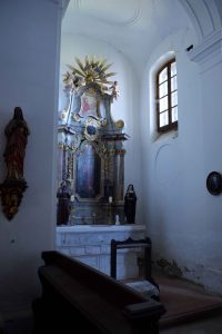 A mellékoltár nem összetartozó elemekből áll. A menza azonos alakítású a főoltáréval: egyenes oldalú falazott tömb, az épülettagoló elemekkel rokon, vakolatból képzett plasztikus klasszicizáló későbarokk (copf) díszítményekkel, fehérre meszelve. Az oltár felépítménye azonban a menzánál korábbi, faragott, márványmintás festésű, aranyozott fa. Két szakaszra tagolódik: az alsó lábazati sáv felett pilaszterekkel és enyhe ívvel rézsűsen előreugró szabadon álló oszloppal keretezett, a középrészt Szent Flórián olajképe foglalja el. A szélső építészeti tagozatokat párkány zárja, az oltárkép felett a készíttető faragott festett címere átnyúlik a felső, oromzatos szakaszba, ahol a párkányszakaszokra támaszkodó, azok ívelten előreugró vonalát követő voluták fogják közre az oromzatot, amelyet törtvonalú, kosáríves záradékú párkány koronáz.