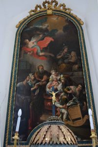 Az oromzatban lant-alakú keretben Szentháromság-olajkép található. A párkányon térdeplő angyalpár, köztük egy-egy puttófej, legfelül sugárkoszorúba foglalt Isten szeme applikáció figyelhető meg. Egy részlet talán arra utal, hogy nem az eredeti összeállításban látjuk a retablót sem: a Szent Flórián-kép kosáríves záródású kerete nem illeszkedik a számára kihagyott szegmensíves nyílásba.