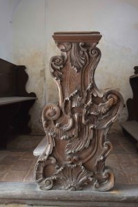 Az oltár középrésze és a szélső építészeti tagozatok közt a lábazati zónában egy-egy szoborkonzol található. Az eredeti szobrok azonban hiányoznak, balra feszületet, jobbra egy későbbi Szent Antal-szobrot állítottak ide. A menza szélein további két későbbi, stílusában, kvalitásában nem az oltárhoz illő szobor kapott helyet.