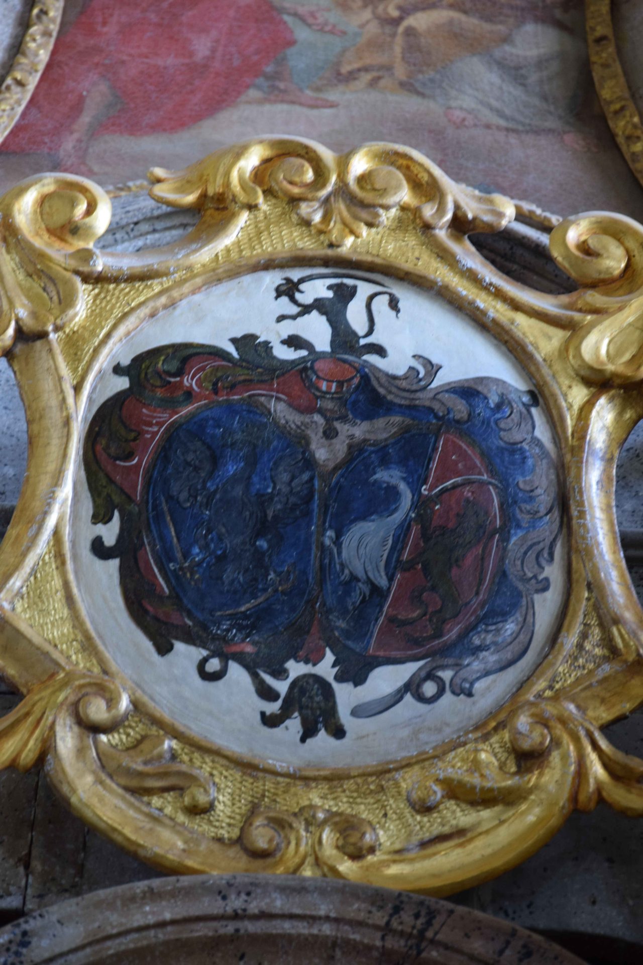 Figyelemre méltó az oltáron elhelyezett kettős címer is. A két ovális pajzsot lombkoszorú övezi, felette további heraldikai jellel. Balra a Mezőszegedy Szegedy-család címerállata, a koronás fekete sas, karmai közt kard és tőr. Jobbra az első barokk templomot építtető II. Ferenc második feleségének, Medgyesi Somogyi Rozáliának címere látható: az előtérben hármas halom, felette pajzs ferdén kék és vörös mezőre osztott, az egyik mezőben felemelt lábával követ tartó daru, a másikban ágaskodó kettős farkú oroszlán, jobbjában kardot tart. Utóbbi még egyszer megjelenik a címer felett. A címer indás-volutás faragott kerete összhangban áll az oltár részleteivel, feltehetően vele egykorú. Ezek alapján valószínű, hogy az első barokk templom oltára, esetleg főoltára lehetett.