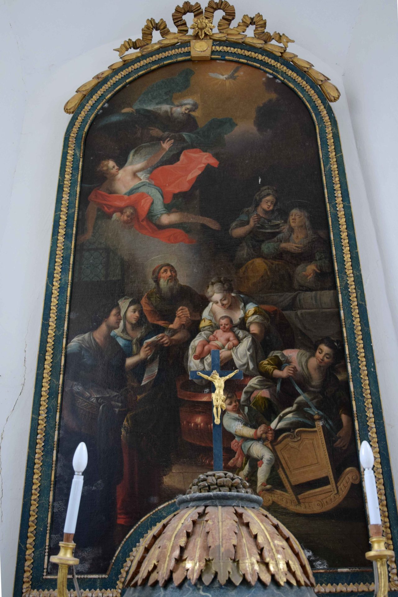 Az oltárkép kerete egyszerű vonalvezetésű, klasszicizáló díszítésű, alsó szélén az ív épp az előtte álló tabernákulum formáját követi. A keret szélső egyenes szakaszai falba foglalt egykorú konzolon támaszkodnak. A keret félköríves záradéka felett visszafogott levélfüzér és szalagdísz. A nagyméretű olajfestmény sokalakos jelenetben mutatja be a templom titulusát, Szűz Mária születését, illetve az azt követő pillanatokat, a fürdetésre készülést. A középpontban a kis Mária tekintete egyenesen a nézőre irányul, természetes fény ragyogja körül. A csecsemőt egy előrehajló fiatal szolgálólány fehér lepellel takart kezében tartja a vízmedence fölé. A medence alakja és szerepe egyaránt előrevetíti a keresztelést. Tőlük balra az idős, botjára támaszkodó Szent Joachim tekint fel az égbe. Mögöttük, jobbra fent a félhomályos háttérben a szülőágyon Szent Anna látható, aki szintén az égre tekint, mellette egy segítő asszony az erősítő, forró levest fújja. Szent Anna egyik kezét szívére hajtja, másikkal lefelé mutat a gyermekre, illetve az előtérben tevékenykedő kis csoportra, akik a bölcsőt készítik elő, hosszú kék szalaggal átkötve: a részlet képi utalás Mária kék övére, ezáltal mennybevételére. A másik oldalon két segédkező alak, egyikük törölközőket hoz, a másik – az ószövetségi jövendöléseket tartalmazó – irattekercset olvas. A kép felső negyedét a mennyei szféra foglalja el: komor felhők közt egy angyal mutat a felette megjelenő Atyára, aki jobbjában filigrán jogart tart, baljával a köpenye mély árnyékos öblére mutat, ahol Ádám és Éva apró figurája sejlik fel a Bűnbeesés pillanatában. Az Atya feje fölött jobbra a Szentlélek galambja jelenik meg, a Szentháromság általános ikonográfijának elemei. Így képi elemekkel kap hangsúlyt a hiányzó harmadik személy, ami egyben magyarázza Mária üdvtörténeti szerepét.