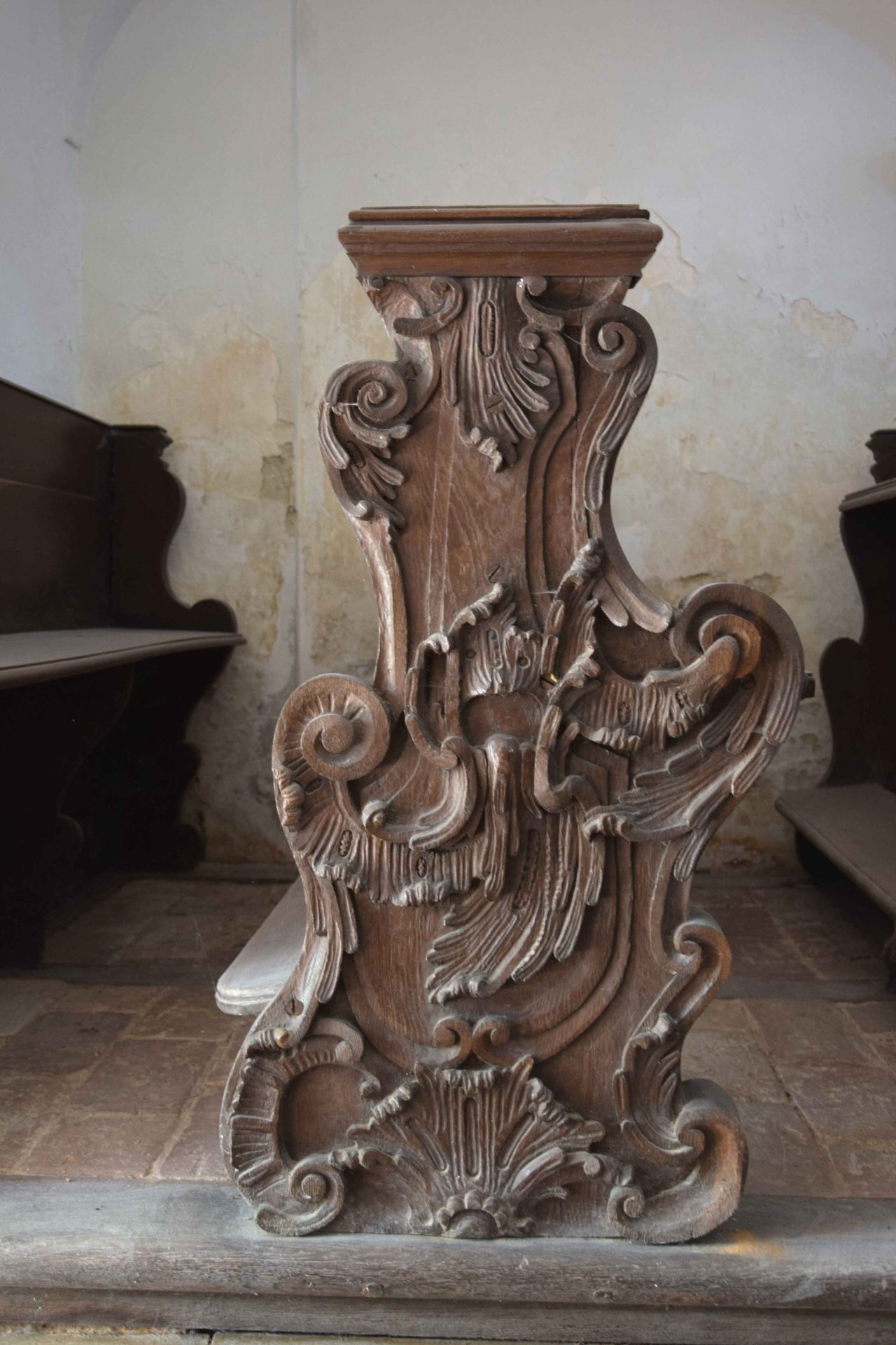 A templom berendezési tárgyai közül kivételesen szépek a gazdagon faragott rokokó padok a hajóban, illetve egy egyszerűbb a karzaton. Ritka műtárgy-együttest alkotnak a sekrestye márványmintás festésű faragott fa berendezési tárgyai: a gazdagon profilált ajtótok, az eredeti szerelvényeivel megmaradt osztott ablakai, a térdeplő és a kézmosó állvány. Néhány helyen, így a sekrestyében, a padok közt, a toronyaljban és a karzaton még a régi téglapadló látható.