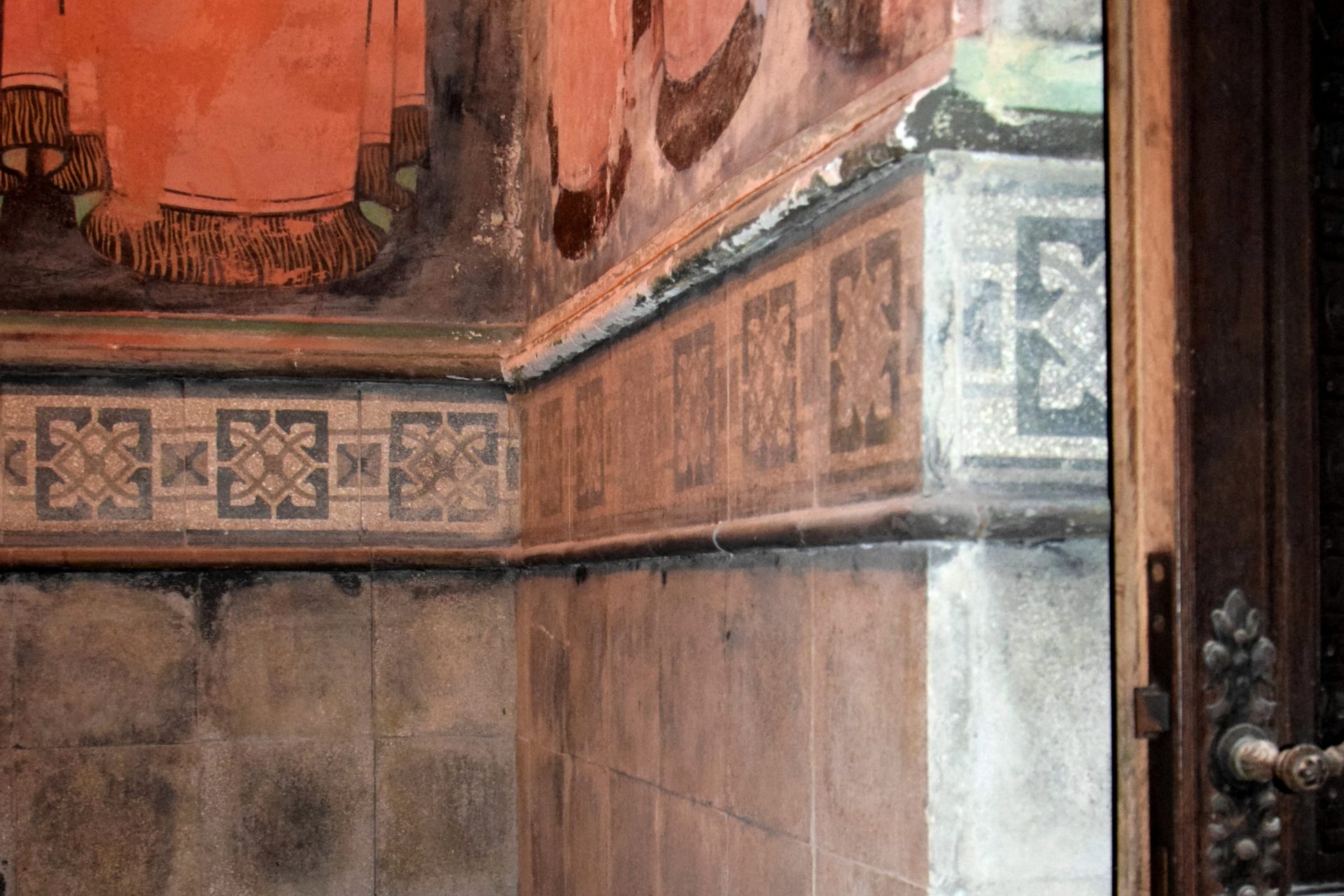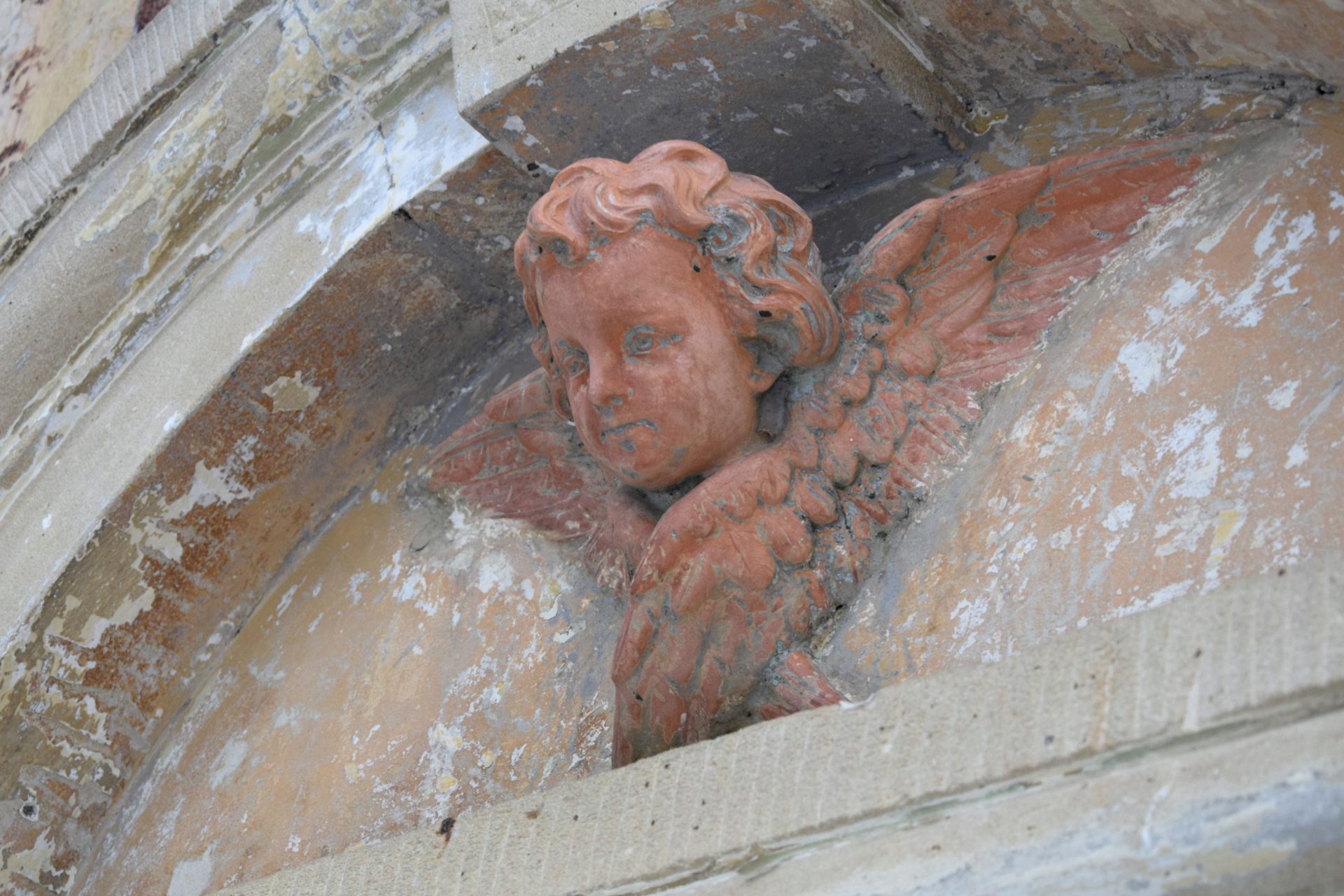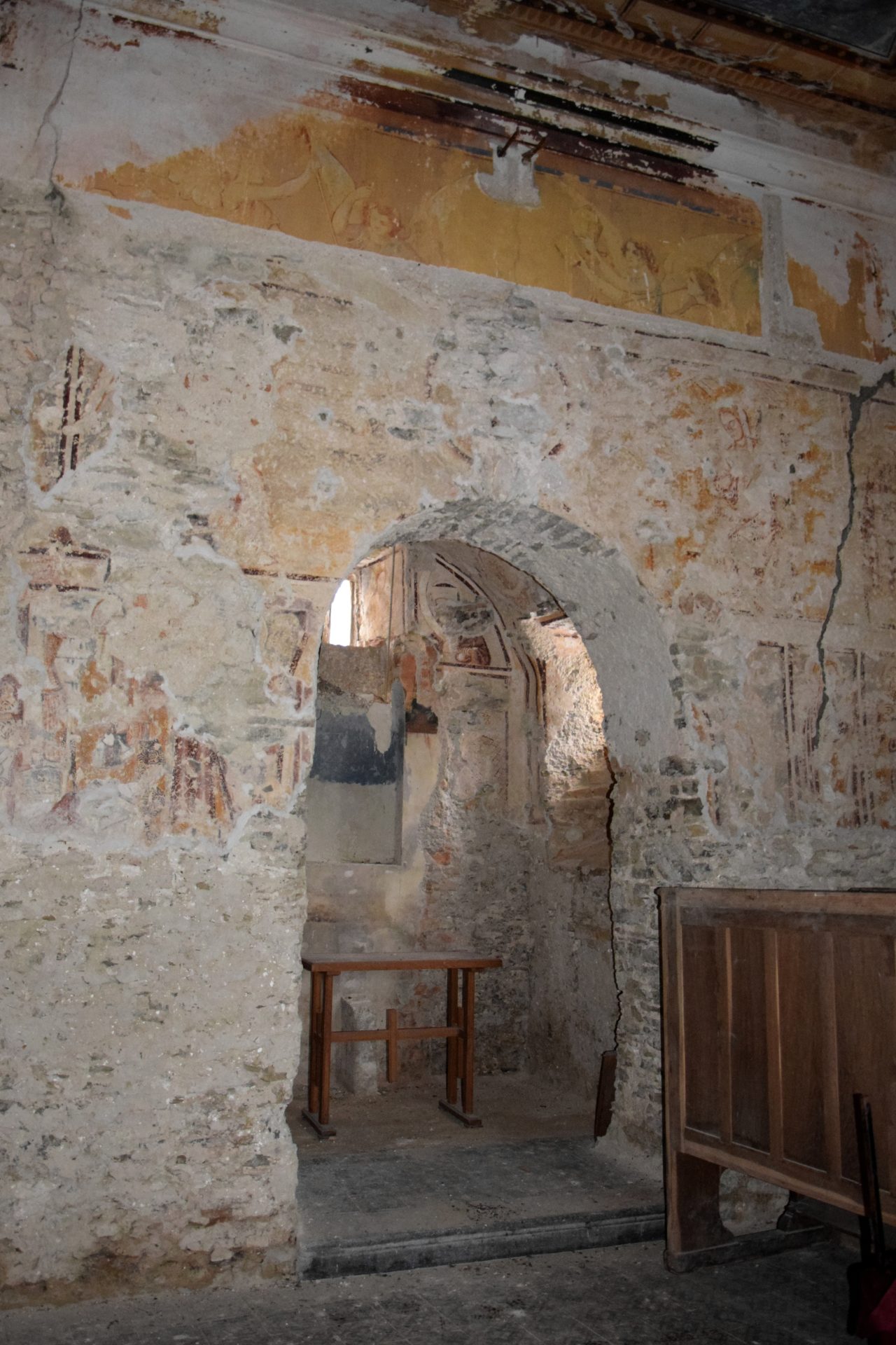 A restaurátori megfigyelés szerint a 20. század eleji kifestés rossz megtartású enyves festékkel készült, ami hamar pusztulásnak indult, és később gyenge minőségű felülfestésekkel javították. A diadalív felett a feltárásokat követően is megmaradt a 20. század eleji alakos kifestés felső része: angyalok harsonákkal és bíborosi jelvényekkel.