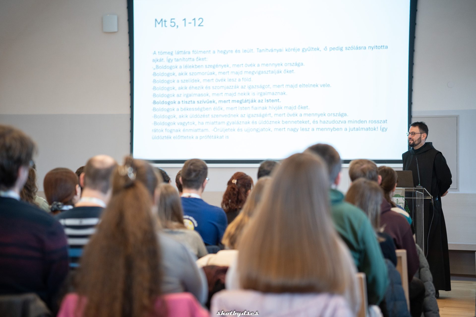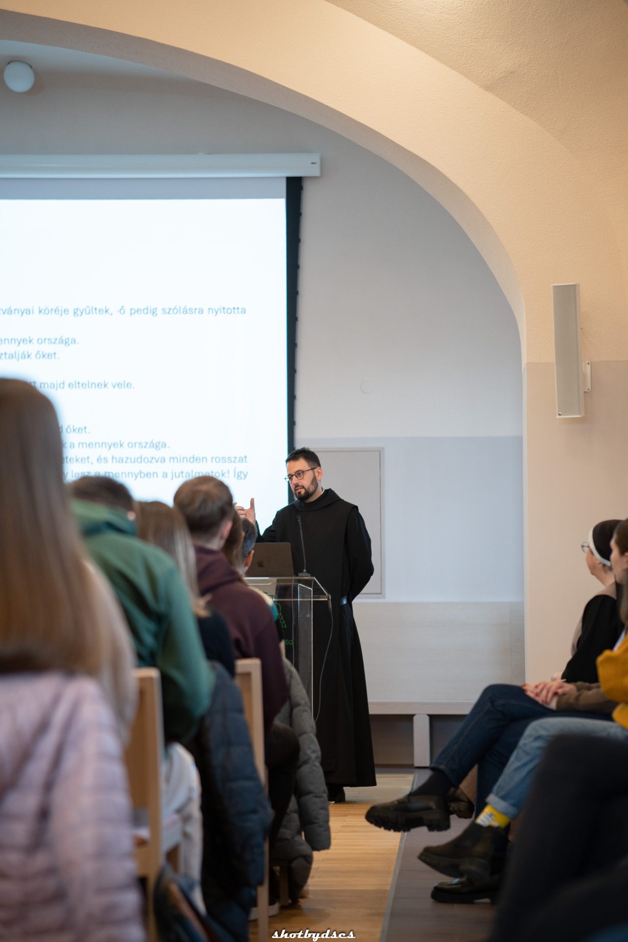 Reggelit követően a Nagyszeminárium épületében délelőtt 9 órakor Mogyorósi Ányos tihanyi bencés atya tartott egy igazán tartalmas előadást a nyolc boldogságról, ezt követően a résztvevők az előadás alapján kiscsoportos beszélgetésben vettek részt, és dolgozták fel közösen a korábban hallottakat.