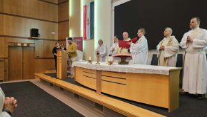 A rekollekció programja szentmisével zárult, amelyet a jelen lévő atyákkal együtt az Érsek atya celebrált. Érsek úr homiliájában hangsúlyozta, hogy életünk és szolgálatunk középpontjában Isten jelenléte áll. Rámutatott arra, hogy az Eucharisztia, mint hálaadás Krisztushoz vezet, aki önmagát ajándékozza, és ebből a vele való kapcsolatból fakad a hiteles imaélet, a hitoktatói szolgálat és az apostoli küldetés: hogy tanítványainkat Isten jelenlétének felismerésére segítsük, és életünkkel tegyünk tanúságot róla.