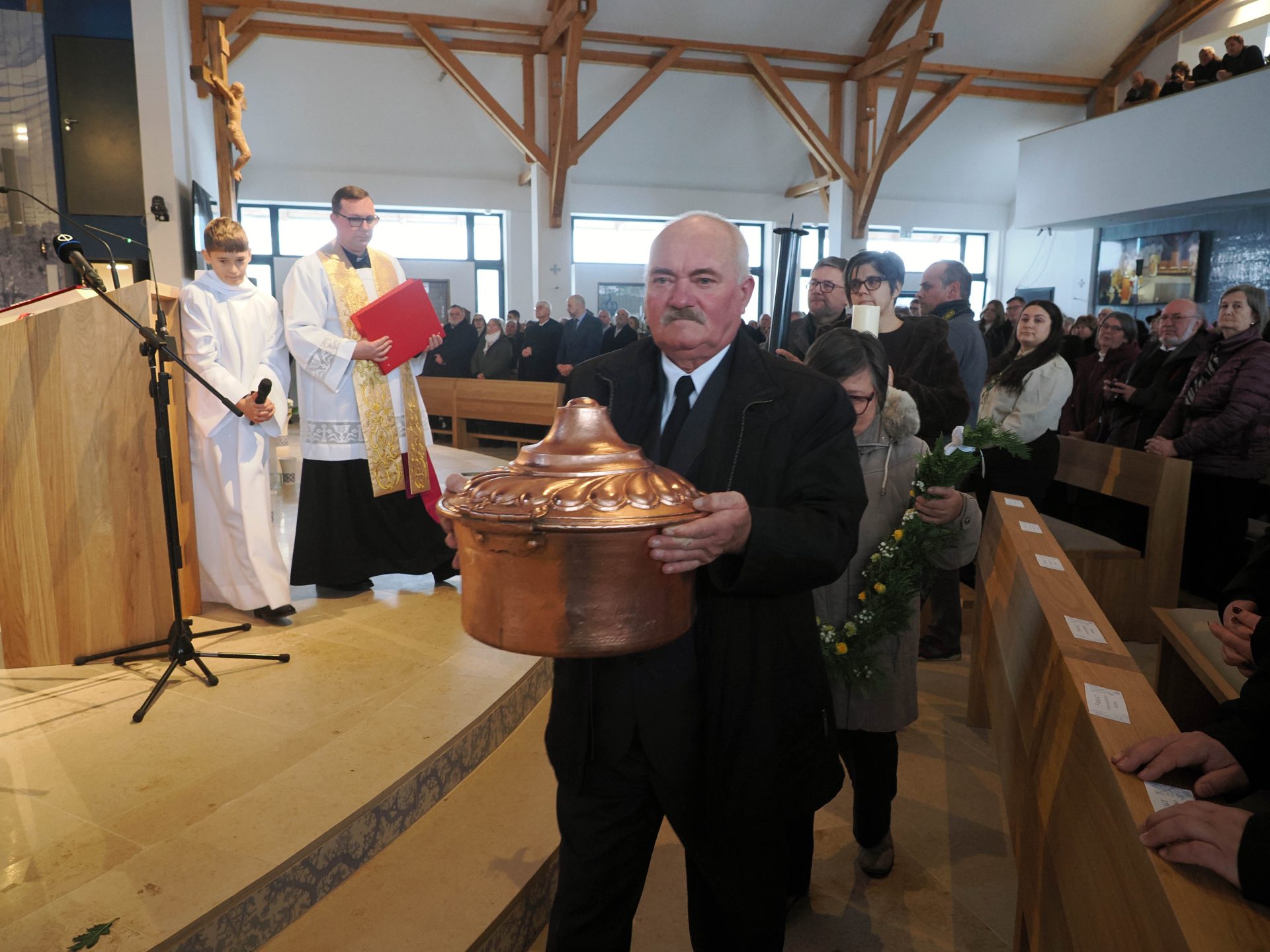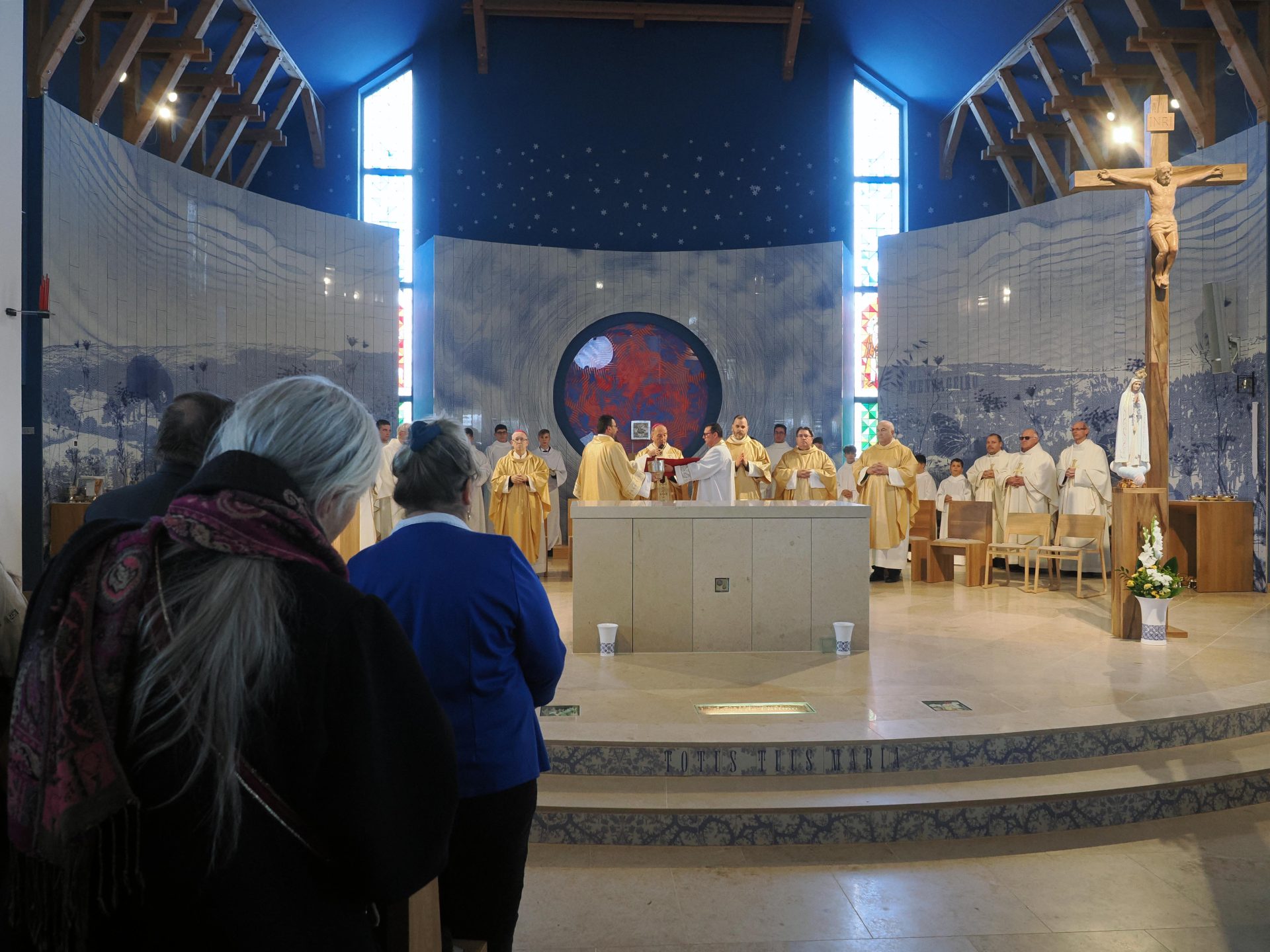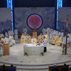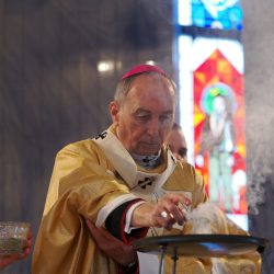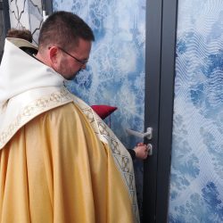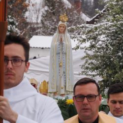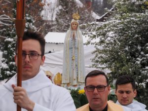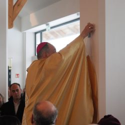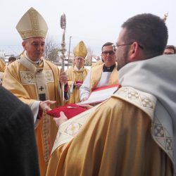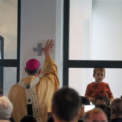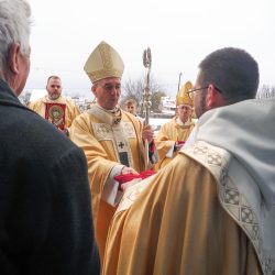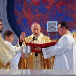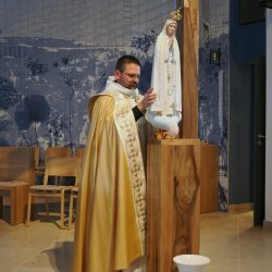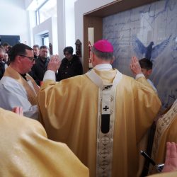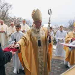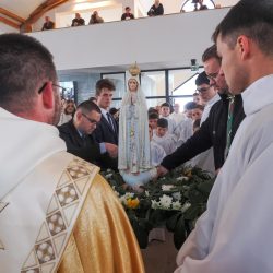A liturgia a Szűzanya szobor elhelyezésével folytatódott majd érsek atya megszentelte a vizet, amivel körmeneteben meghintette a templomot és a jelenlévő híveket.