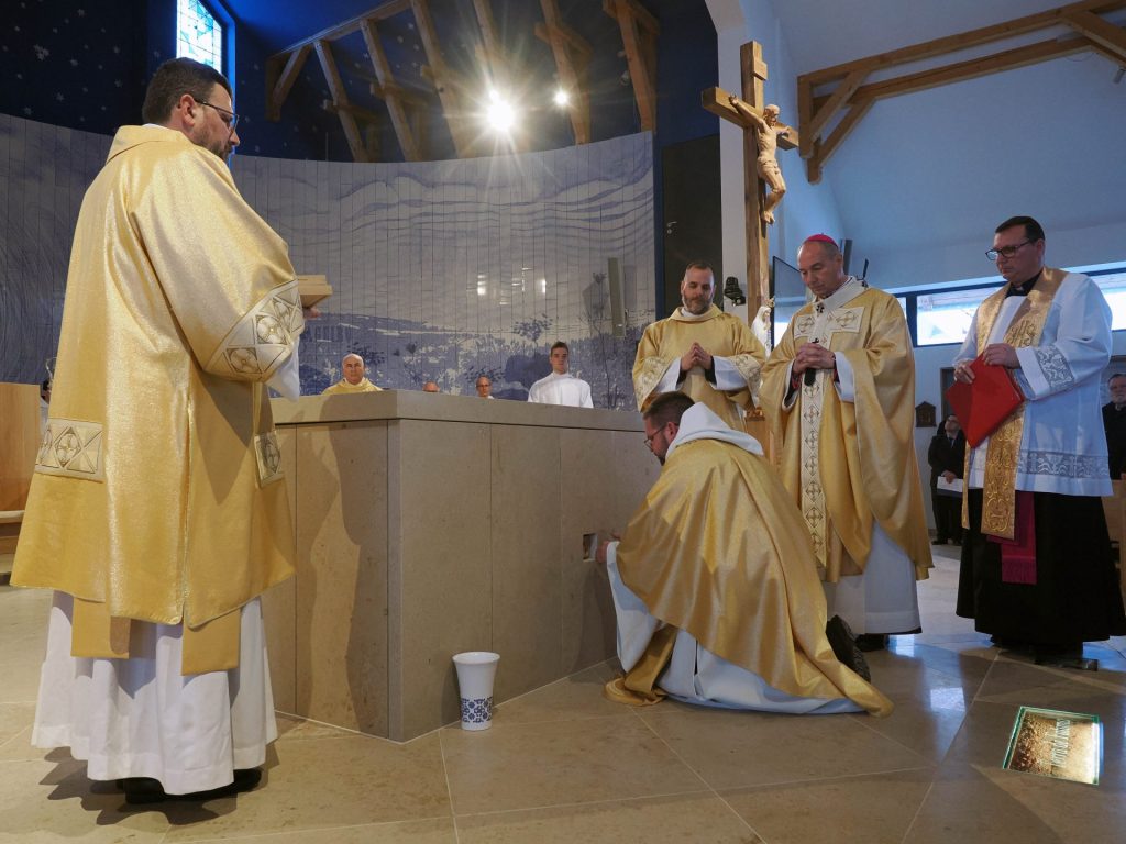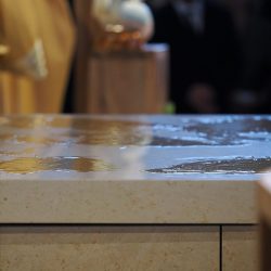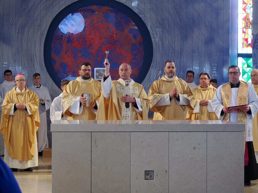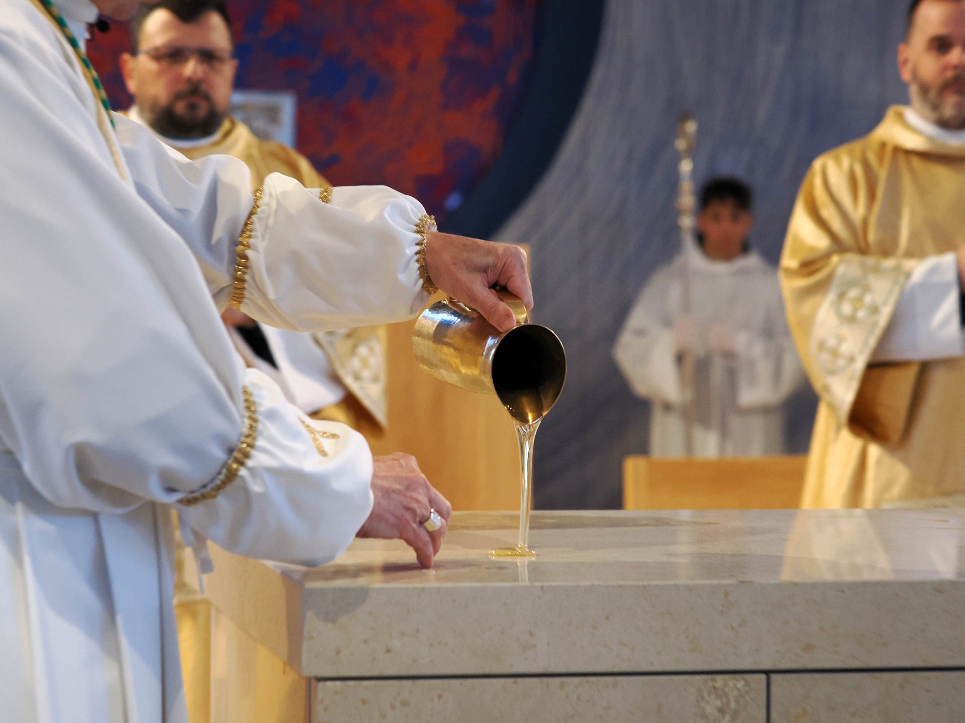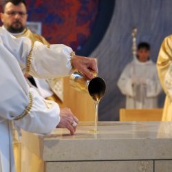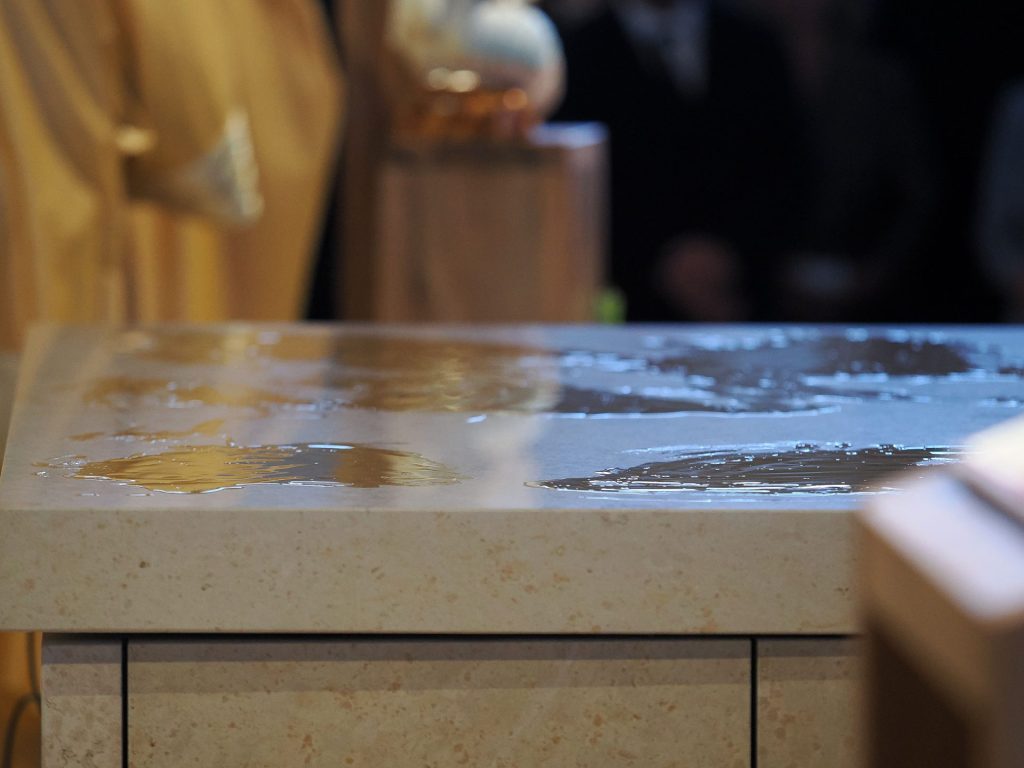 A templomszentelés liturgiájának egyik legmegrendítőbb pillanata az oltár krizmával való megkenése. A krizma – az egyház legillatosabb és legszentebb olaja – Krisztus erejét, jelenlétét és a Szentlélek kiáradását jelképezi. A főpásztor a szent olajjal kereszt alakban megkente az oltárt, ezzel szentelte fel azt arra, hogy Isten és ember találkozásának helye, Krisztus áldozatának asztala legyen. Ettől a pillanattól kezdve az oltár nem egyszerű kő, hanem a szentmise misztériumának központja lett.