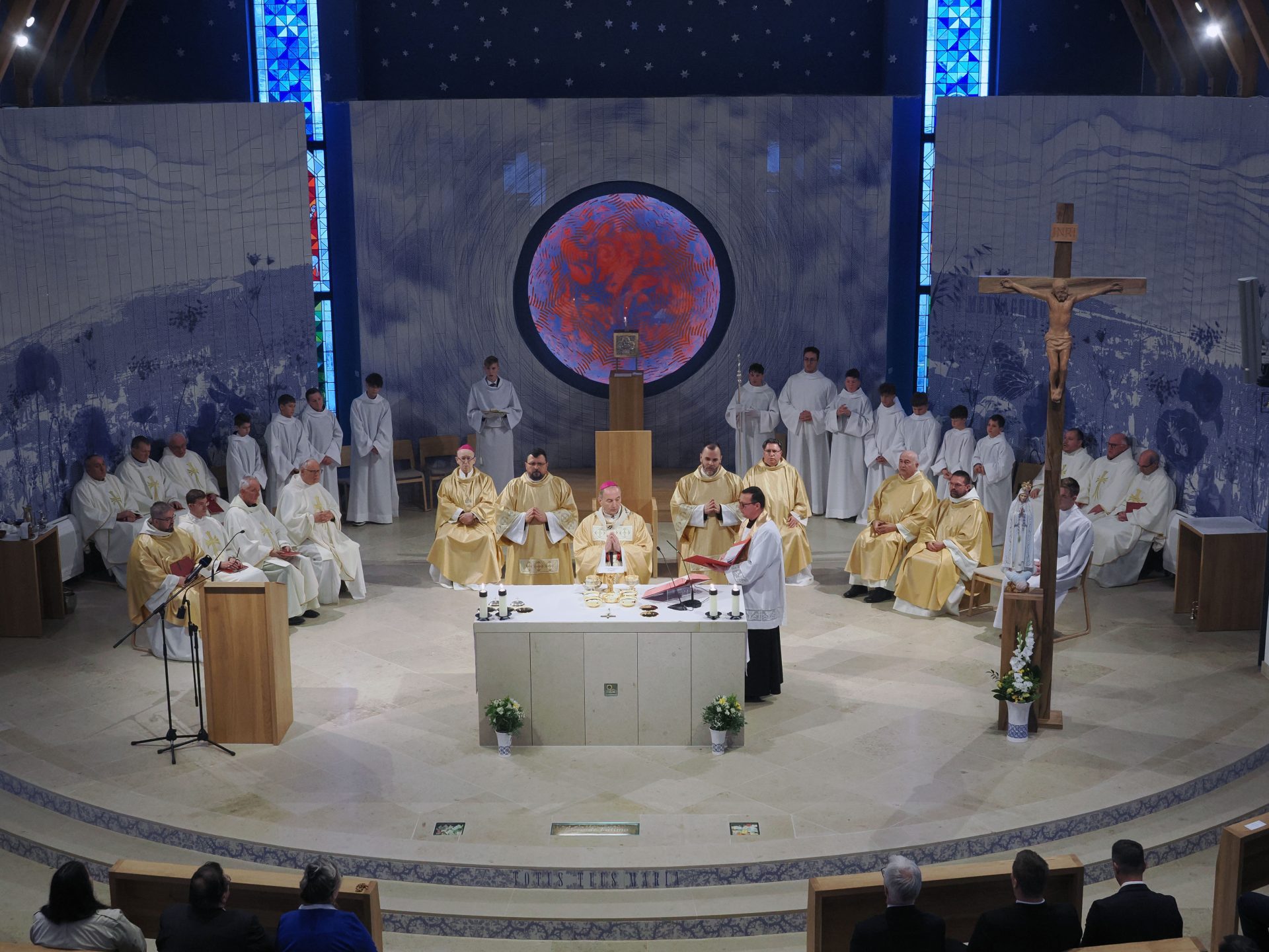 Hangsúlyozta:Krisztus győzött a gonosz felett, és visszavezetett bennünket az Atyához. Az Egyház minden tagjára rábízza a kiengesztelődés szolgálatát: az imádság, az engesztelés és az evangélium hirdetésének küldetését. A templom ezért az imádás, az engesztelés és az igehirdetés helye lesz – különösen itt, ahol Mária fatimai üzenete mutat utat a zavaros kor kihívásai között. A Fatimai Szűz Mária figyelmeztetése – a bűnbánatra, az engesztelésre, a Krisztushoz való ragaszkodásra – ma is aktuális. Érsek atya kiemelte: a templom építésének kezdete óta Mária oltalma alatt kívánt megmaradni a közösség, és a hely ma is ennek az oltalomnak kíván látható jele lenni.