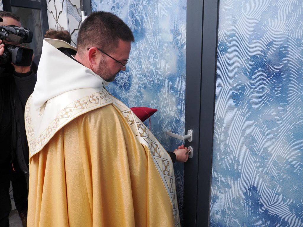 Az ünnepi liturgia a Fatima-házban kezdődött, ahonnan körmenetben érkezett meg az új templomba a Fatimából hozott Szűz Mária szobra. A templom zárt kapujához érve érsek atya köszöntőjében így fogalmazott: „Örömmel dicsőítjük a Szentháromságos egy Istent, Krisztust, a világmindenség Királyát, kérve, hogy legyen életünk és közösségeink Ura, miközben a Fatimai Szűzanya imádságban támogat és oltalmaz, s így áhítattal gyűlünk össze e templom felszentelésére, hogy Isten igéjét hallgatva és Krisztus áldozatából táplálkozva lelki templommá növekedjünk, és az oltár köré gyűlve erősödjünk az égi szeretetben.” Ez után a főpásztor ünnepélyesen átadta a templom kulcsait Gere Dávid Márk SMC plébános atyának, aki kitárta az új templom ajtaját.