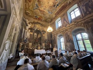 Másnap Böcskei László püspökkel ünnepeltek szentmisét a veszprémi pap-zarándokok a nagyváradi püspöki palota Borromeo Szent Károly kápolnájában, ahol egykor Boldog Apor Vilmos győri püspököt, vértanút áldozópappá, Boldog Bogdánffy Szilárd püspököt, vértanút pedig diakónussá szentelték. Böcskei püspök úr a szentmisét követően bemutatta a püspöki palotát, betekintést adva a váradi püspökök városépítő, kultúrateremtő tevékenységébe. Az atyák a püspök úrtól tájékoztatást kaptak az egyházmegye helyzetéről és pasztorális céljairól.