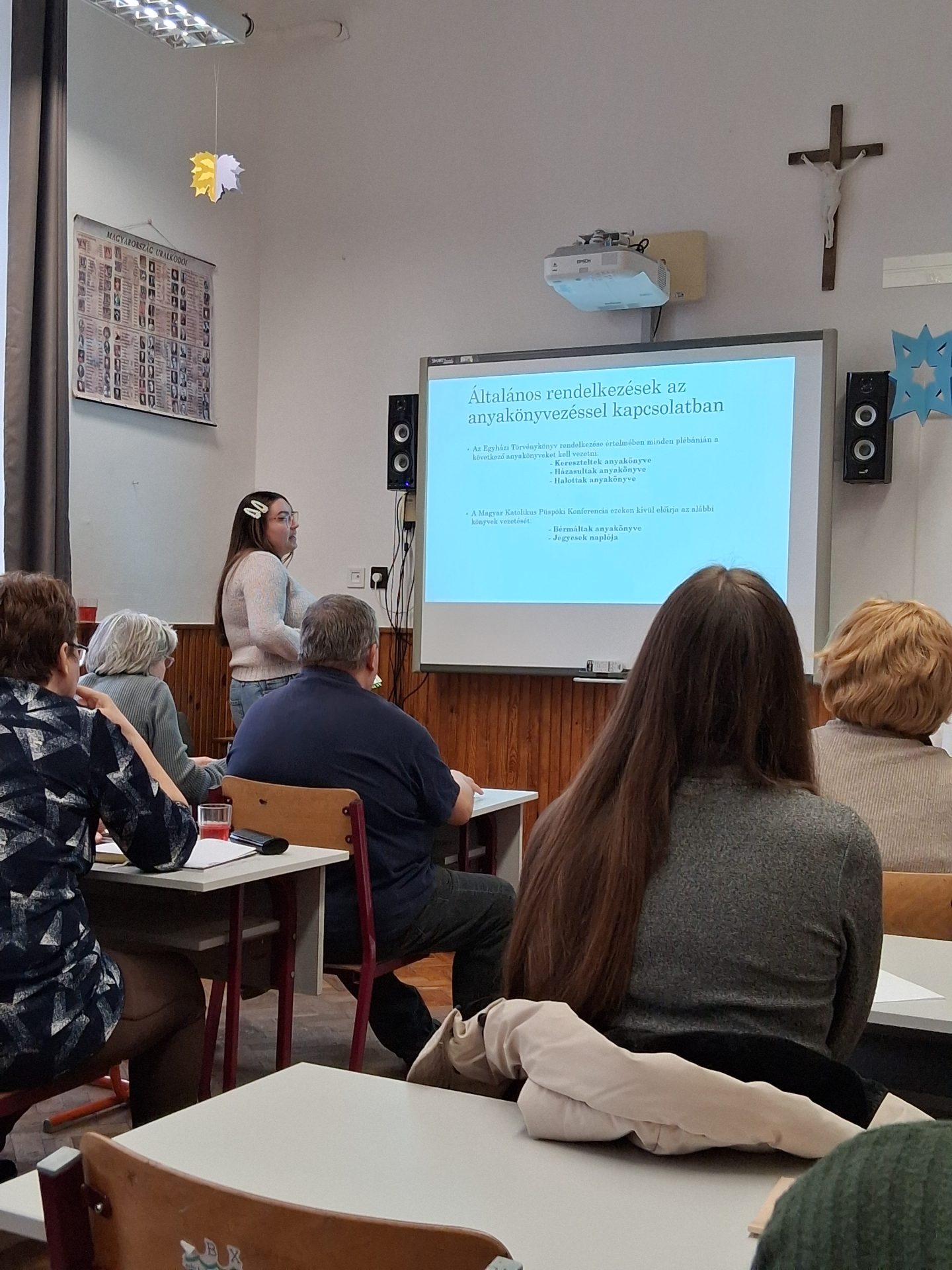 A képzés második felében Szekeres-Bátor Júlia Réka, a Regina Mundi Plébánia adminisztrátora az új anyakönyvvezetési szabályokról beszélt. Előadásában részletesen kitért az új anyakönyvek (kereszteltek, házasultak, halottak, bérmáltak), valamint a jegyesek naplójának kitöltésével kapcsolatos tudnivalókra.