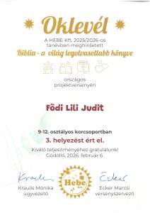 Szívből gratulálunk Lilinek ehhez a szép, országos szintű sikerhez! Ez a helyezés nem csupán a tudásról és felkészültségről árulkodik, hanem arról is, hogy a Biblia ismerete, megértése és szeretete ma is élő, értékes része diákjaink életének.