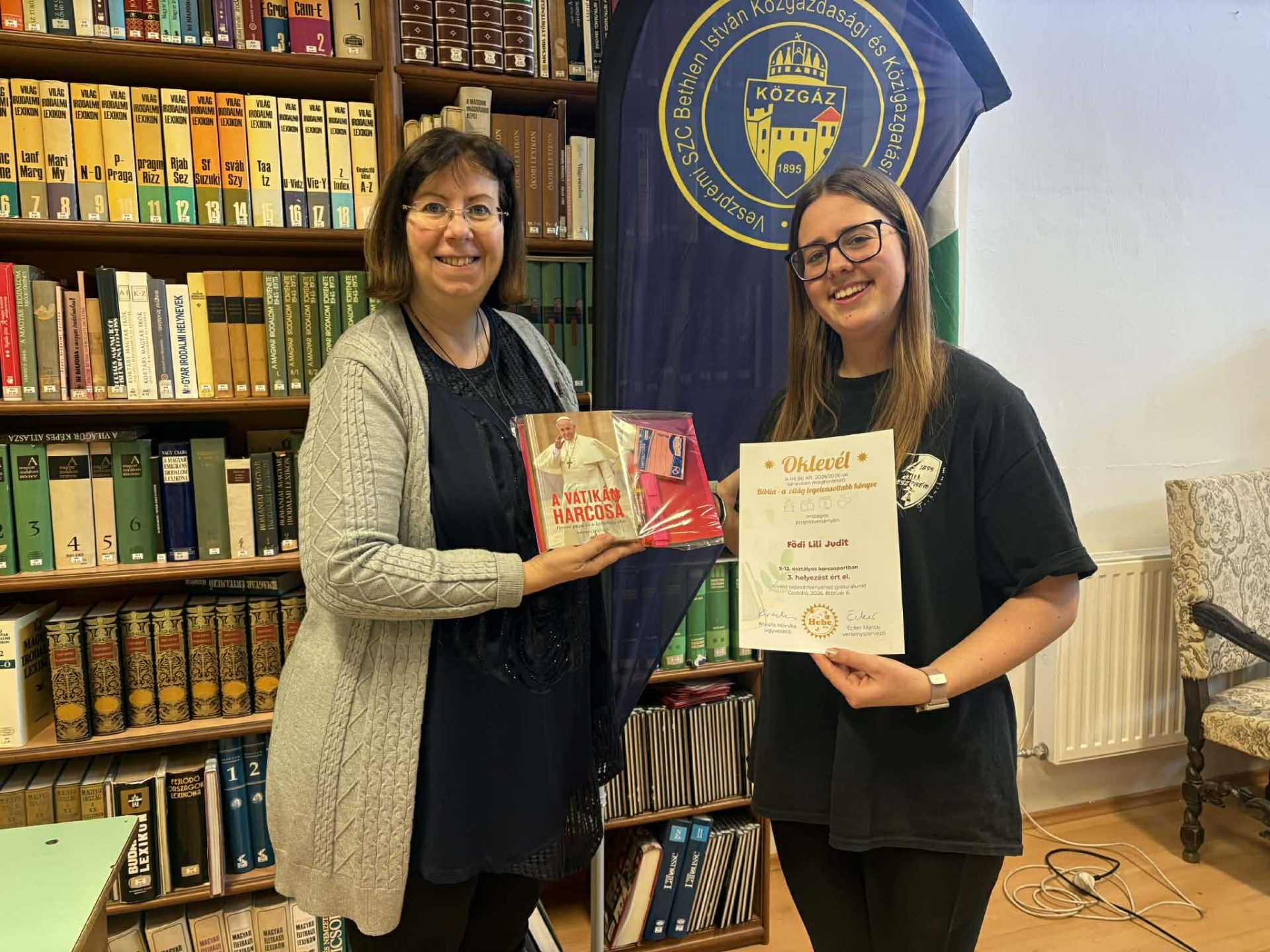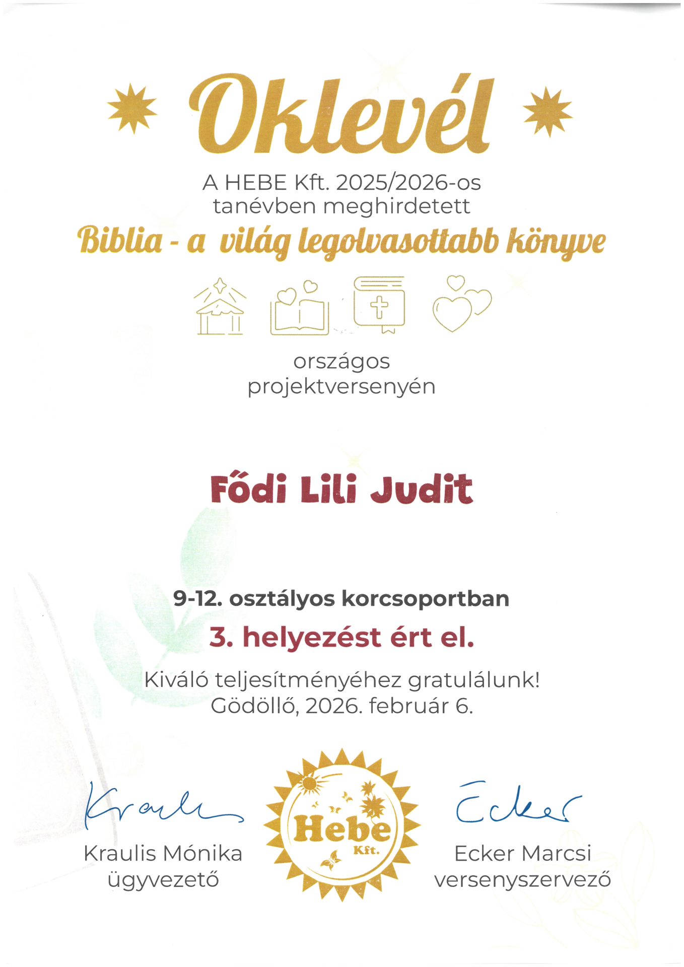 Örömmel osztjuk meg, hogy a 2026-os tanév országos Biblia-versenyén Fődi Lili Judit, a Veszprémi SZC Bethlen István Közgazdasági és Közigazgatási Technikum tanulója 3. helyezést ért el a „Biblia – a világ legolvasottabb könyve” elnevezésű országos projektversenyben.