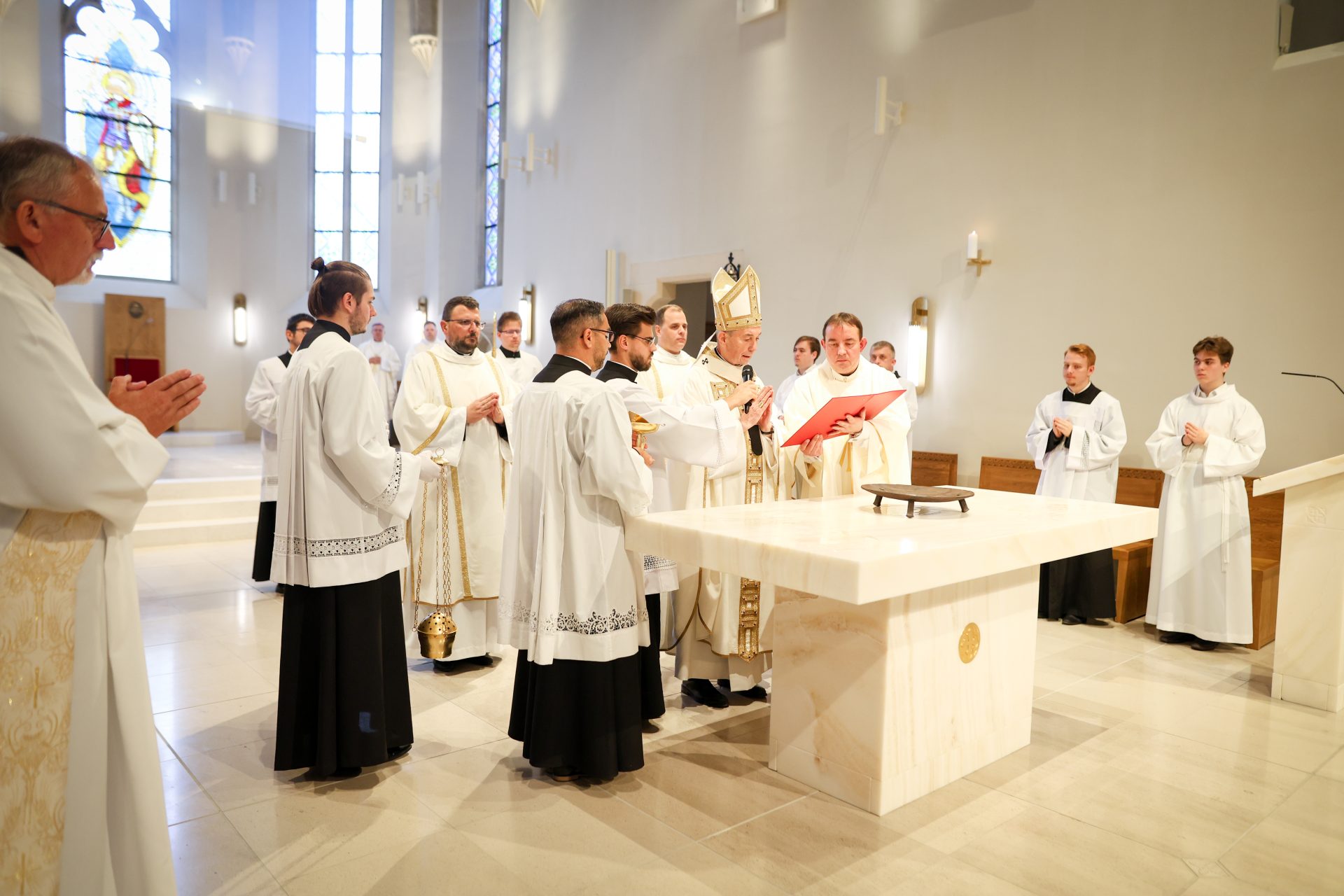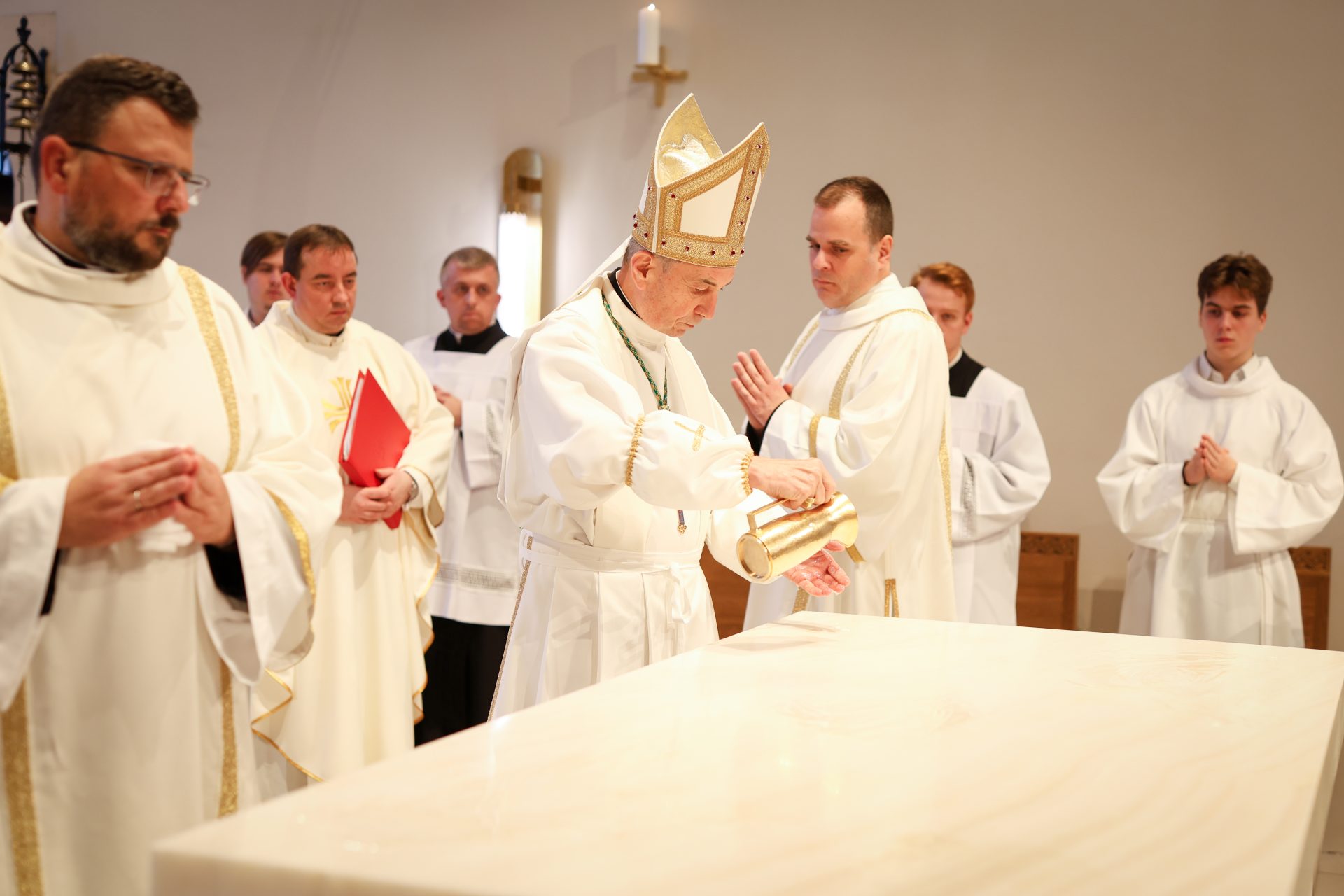 Az oltár konszekrálása egy ünnepélyes felszentelő imádsággal, majd az oltár menzájának a szent krizmával történő leöntésével és megkenésével történt az alábbi szavakkal: