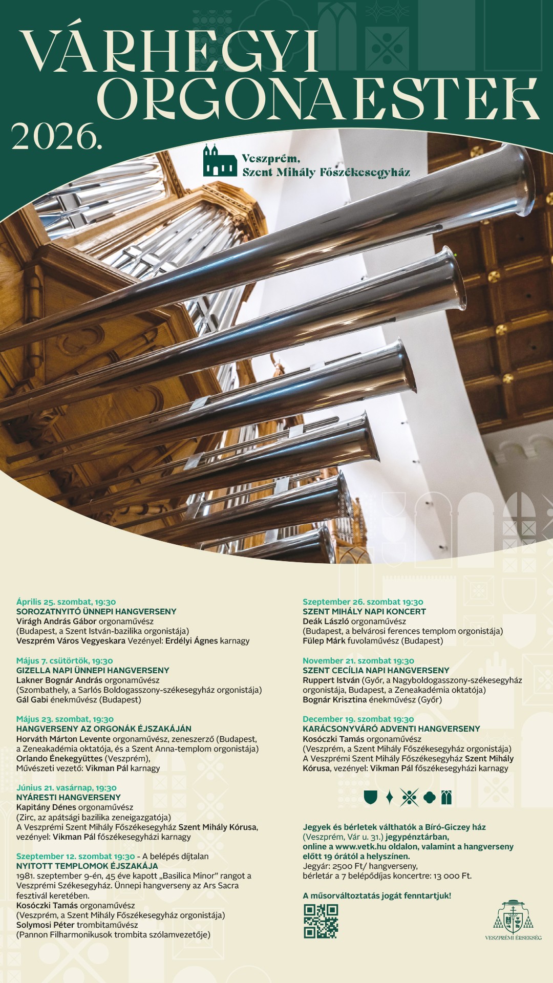 Egész éven átívelő, gazdag zenei és lelki élményt kínáló koncertsorozat indul Veszprémben Várhegyi Orgonaestek címmel. A nyolc alkalomból álló sorozat a Szent Mihály Főszékesegyház megújult, sokoldalú koncertorgonájának megszólaltatására hívja a híveket és az érdeklődőket, lehetőséget adva arra, hogy a zene által is közelebb kerülhessenek az evangélium üzenetéhez.